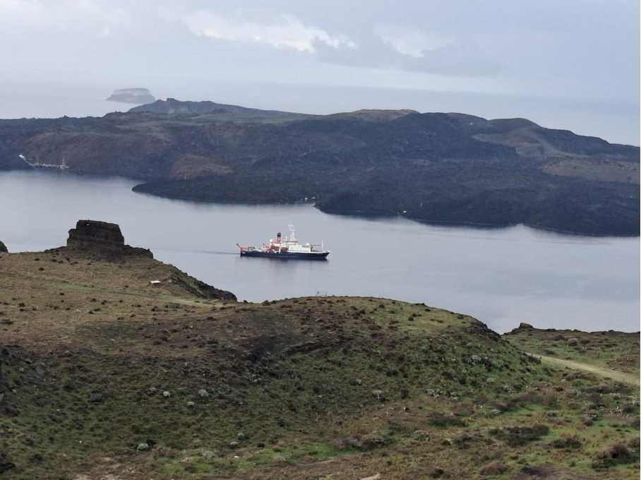 Some of the team are already familiar with Santorini. As part of MULTI-MAREX, some of us have been here several times in recent years, both on board and ashore, and have had the privilege of getting to know some of the stakeholders, students and residents. This makes it all the more enjoyable to see the island and its people again, even though we spend most of the trip looking at the islands’ coastline from a distance from the RV METEOR. Our presence in and around the Santorini caldera does not go unnoticed by the island’s residents, of course. We are always delighted to receive photos of the RV METEOR taken from Santorini. So while we admire the islands of Santorini from the ship, people there are looking back at us. We send our best regards to everyone who has spotted our research vessel over the last few days!