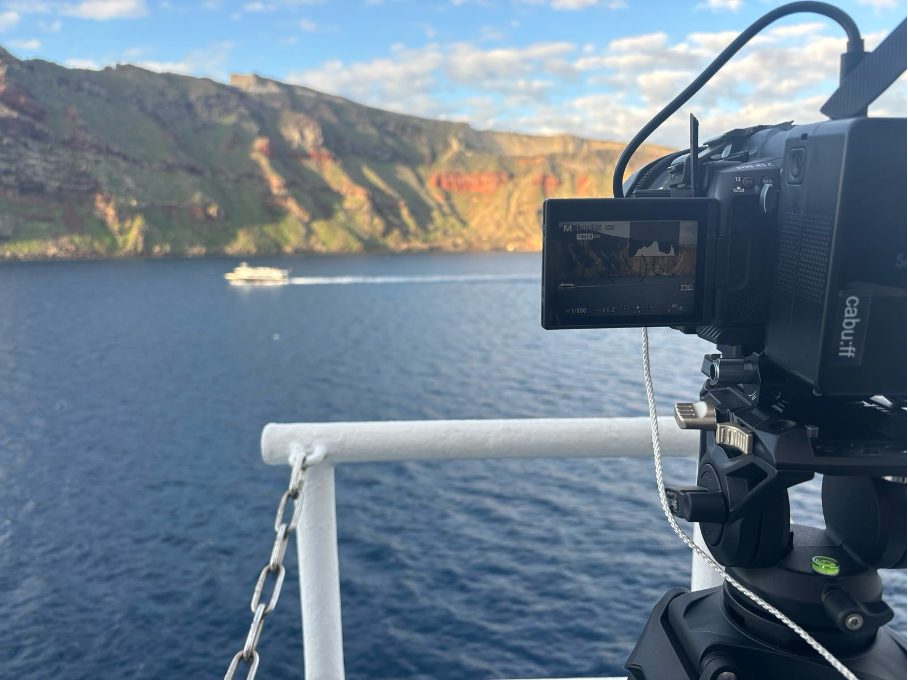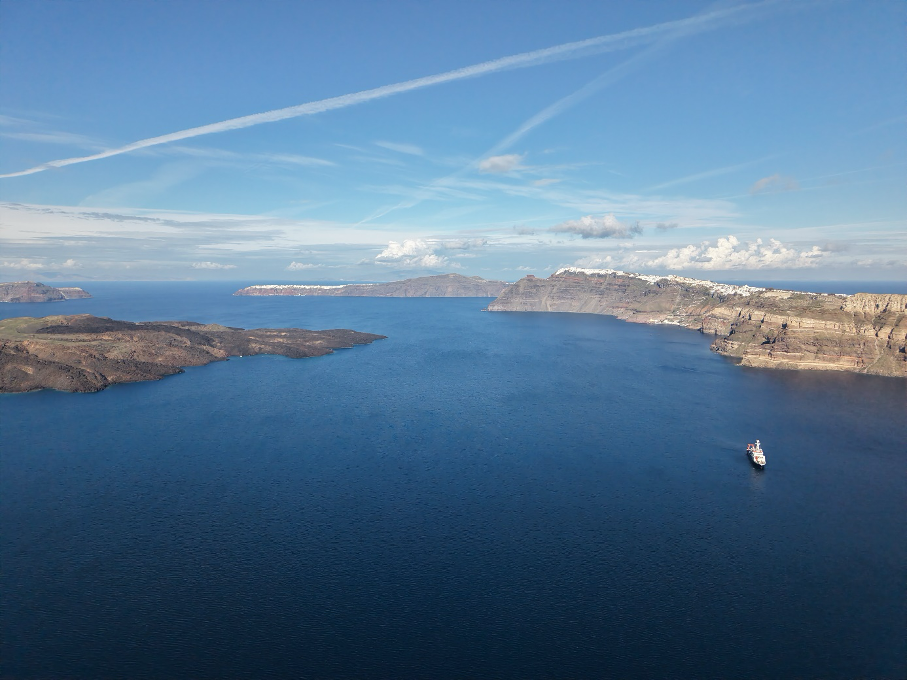 Einem Teil des Teams ist Santorini bereits wohlbekannt. Denn im Rahmen von MULTI-MAREX waren einige von uns an Bord in den letzten Jahren bereits mehrmals hier, zu Schiff wie an Land, und hatten dadurch auch das Privileg, bereits einige der Stakeholder:innen und Schüler:innen, sowie Bewohner:innen kennenzulernen. Umso größer ist die Freude über ein Wiedersehen mit Land und Leuten, auch wenn wir dennoch den Großteil der Fahrt mit etwas Abstand von der FS METEOR auf die Küste der Inseln blicken. Unsere Anwesenheit in und um die Caldera von Santorini herum bleibt natürlich auch von den Bewohner:innen der Inseln nicht unbemerkt. So freuen wir uns immer wieder über Fotos der FS METEOR, die von Santorini aus aufgenommen wurden. Während wir also vom Schiff aus die Inseln Santorinis bewundern, blicken von dort aus Menschen zurück zu uns. Wir senden viele Grüße an alle, die unser Forschungsschiff in den letzten Tagen schon gesehen haben!