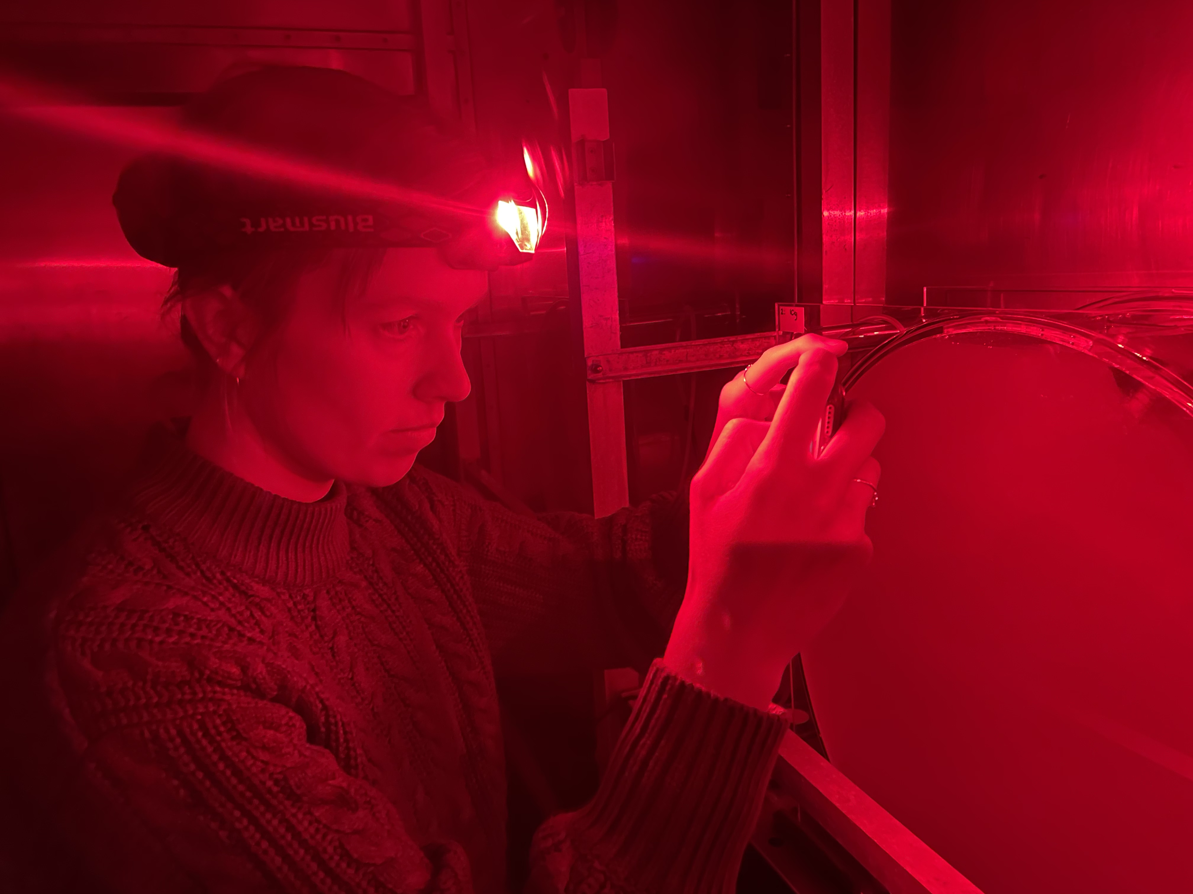Vanessa Stenvers beginnt gerade ihre Doktorarbeit am GEOMAR und untersucht den Einfluß von Sedimenteintrag auf Periphylla. Die Tiefseequallen sind äußerst lichtempfindlich, daher die Rotlicht-Kopflampe in der ansonsten dunklen Klimakammer. Foto: Helena Hauss