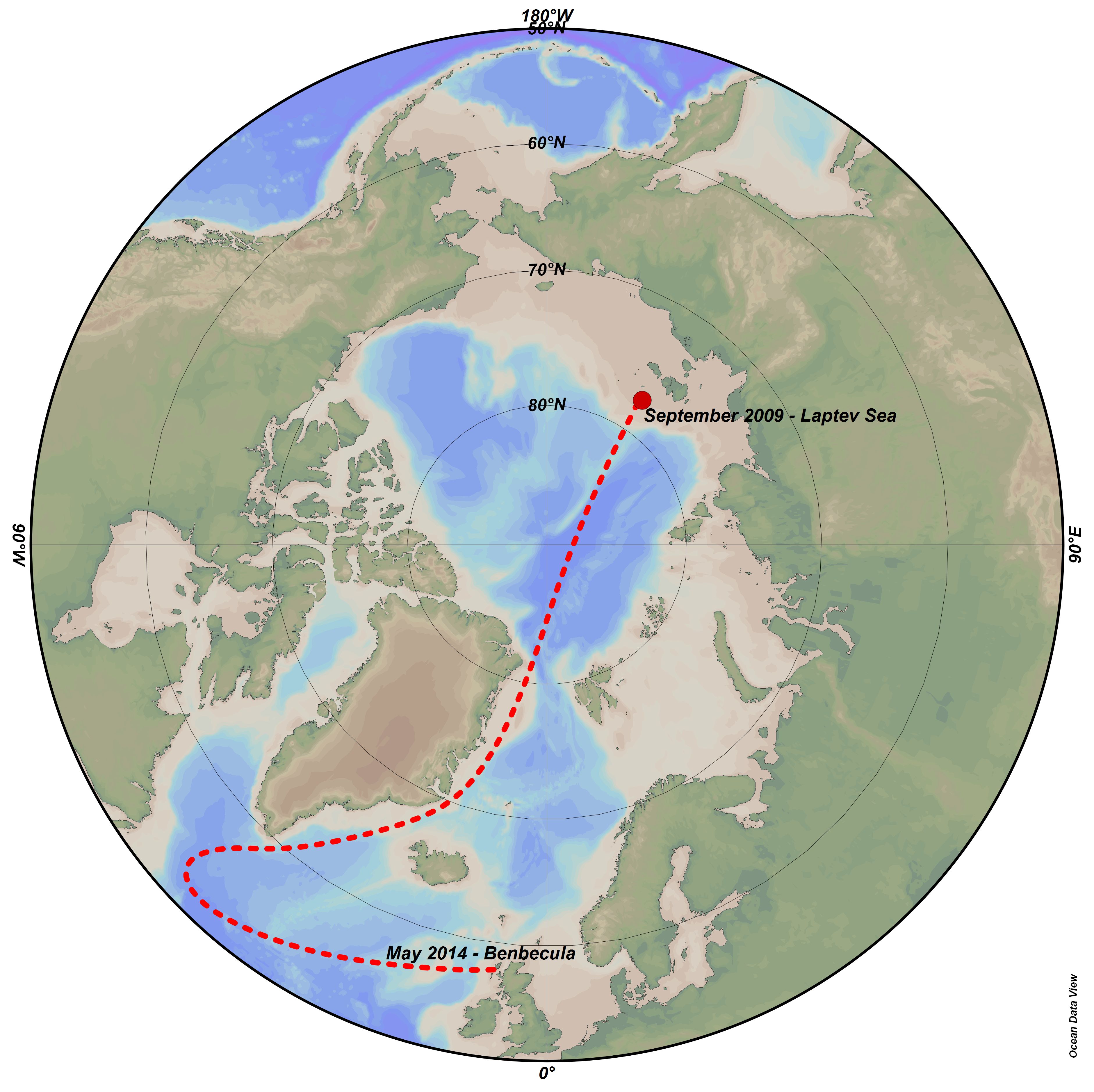 Diese ADCP ist im Jahr 2008 von Jens Hölemann und seinen Kollegen während einer Expedition in der östlichen Laptewsee als Teil eines Meeresobservatoriums ausgesetzt worden, um für ein Jahr Daten zu sammeln. Am 13. September 2009 erreichten die Forscher diesen Standort erneut, um die Messgeräte zu bergen. Aber obwohl der Auslösemechanismus für die Verankerung betätigt wurde, kamen die Geräte nicht an die Meeresoberfläche. Dass dies dann doch noch klappte, bekamen die Forscher nicht mehr mit, da sie aufgrund des engen Zeitplans bereits ihre Arbeiten an anderer Position weiterführen mussten. Am 14. September erreichte die ADCP die Wasseroberfläche und begann ihre lange Reise. Als sich wie in jedem Jahr Packeis bildete, wurde sie wie die „Fram“ zuvor schon darin eingefroren. Viereinhalb Jahre brauchte sie, um zunächst mit der Nordpolardrift nach Grönland zu treiben, wo das Eis schmolz. Weiter ging es mit der Meeresströmung Richtung Nordamerika. Hier gelangte das Gerät in den Golfstrom, der es zurück nach Europa und an die schottische Küste brachte. Die Nachbarin der Coastguard-Mitarbeiterin Liz Allen fand es schließlich zwischen anderem Strandgut.